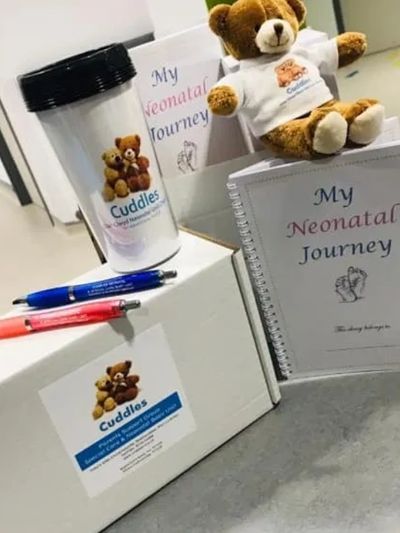 The boxes include a diary for keeping accurate information and appointments, pens, Cuddles teddy bear, information booklet and an insulated mug for parents to have a hot drink whilst around the incubators.